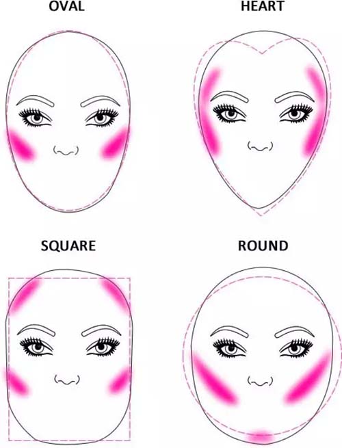 心型脸:将腮红刷在脸颊两侧往上到额头的位子,力道由重到轻,能修饰脸型较宽的上额头。