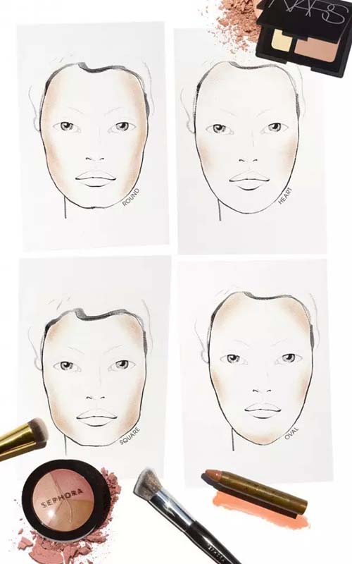 心型脸:选择浅色修容用品加深脸颊两侧的阴影,如果觉得还不够可以在额头与下巴也稍微刷上一点。